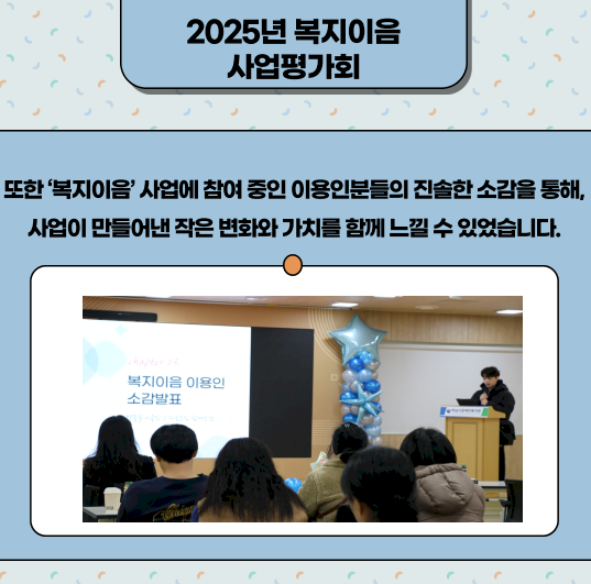 또한 ‘복지이음’사업에 참여 중인 이용인분들의 진솔한 소감을 통해, 사업이 만들어낸 작은 변화와 가치를 함께 느낄 수 있었습니다.