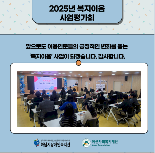 앞으로도 이용인분들의 긍정적인 변화를 돕는 ‘복지이음’ 사업이 되겠습니다.