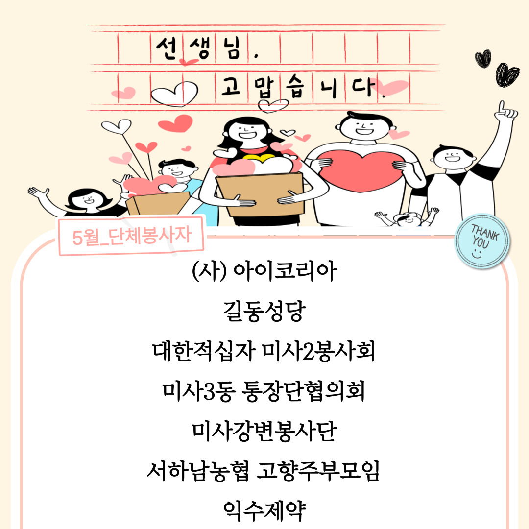 (사)아이코리아 길동성당 대한적십자 미사2봉사회 미사3동통장단협의회 미사강변봉사단 서하남농협고향주부모임 익수제약